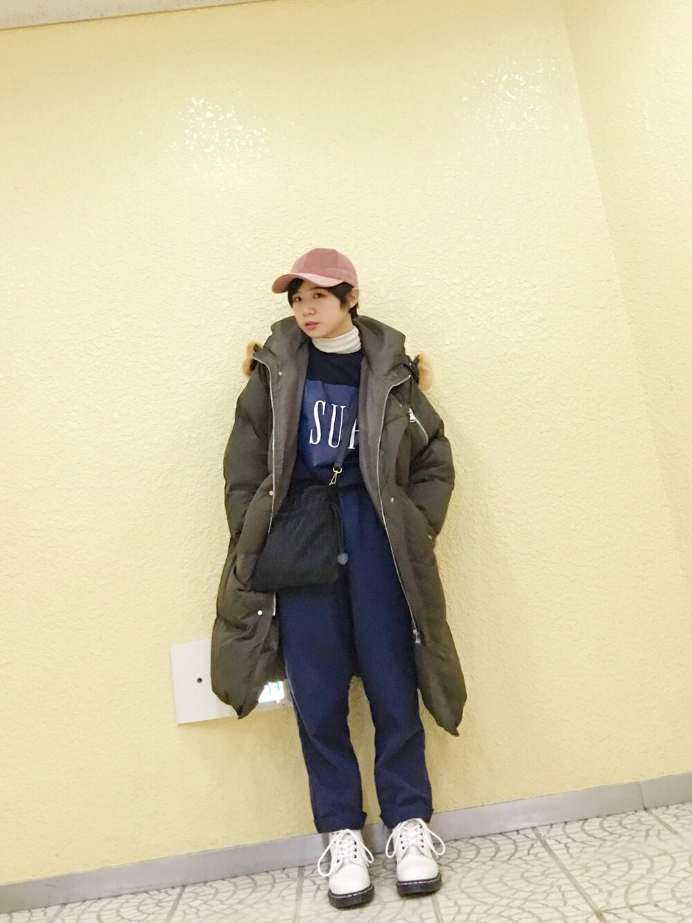 カジュアルボーイッシュに。 オールネイビーコーデにピンクを投入。 このキャップ、形も色味もほんとに可愛すぎて色違いで手に入れてしまった!😂🌟 ダウンはこの冬の戦闘服!! 形かわいいし、めちゃくちゃあったかくて布団着てるみたいやし、最高しかない。 バッグが実はプリーツになってるのもポイント。