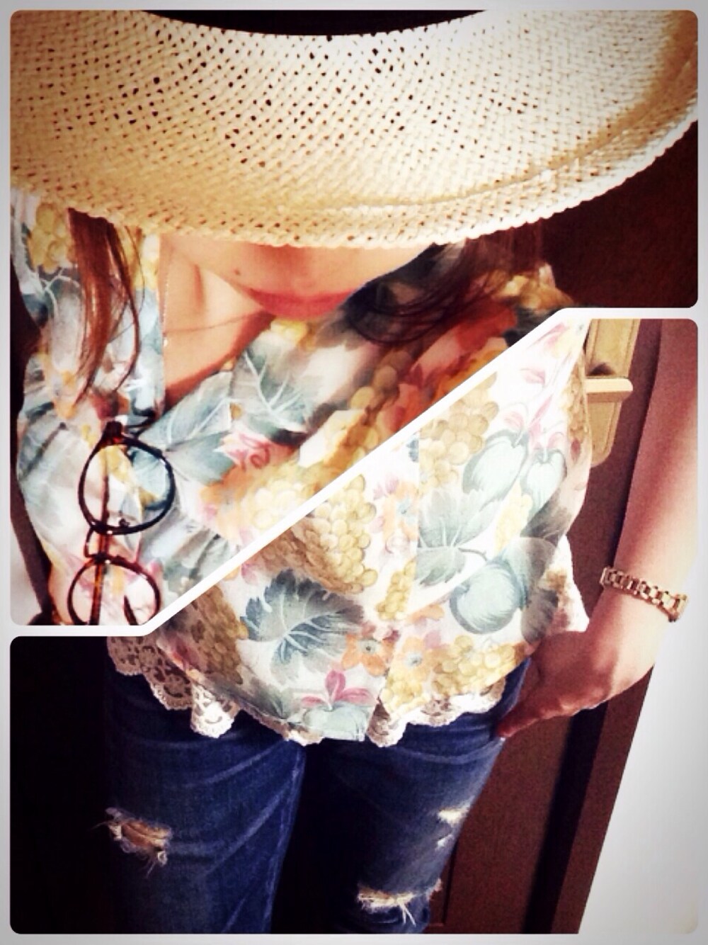 ハット:ブランド不明 シャツ:ブランド不明 キャミ:Ungrid だてメガネ:Ungrid デニム:Ungrid