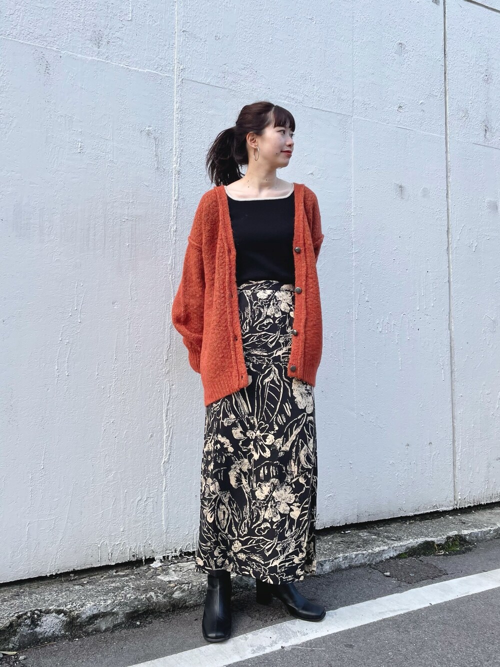 オレンジのカーデを主役に他を黒でまとめて大人っぽくスタイリング。 首元をすっきりと見せるだけで女性らしさがプラスできます!