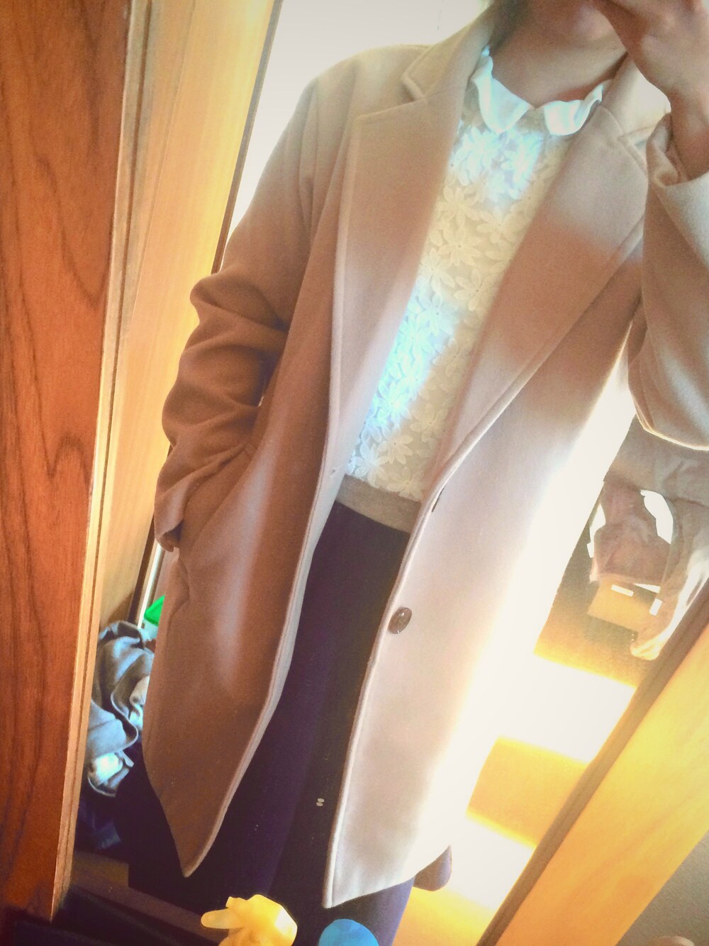 ベージュ系のチェスターコートを着用したレディースの冬コーディネートの1枚目の写真