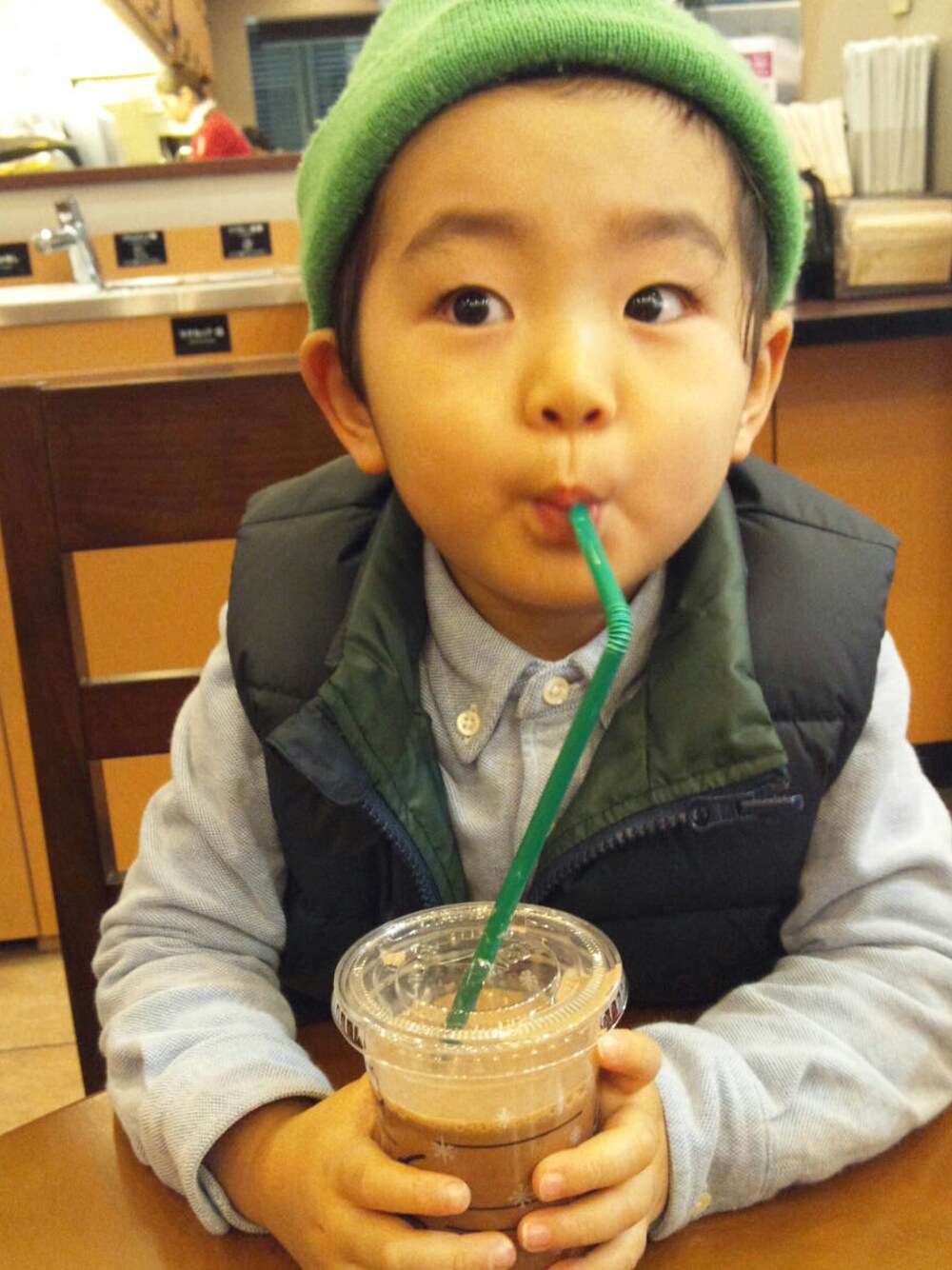 グリーン系のダウンベストを着用したキッズの冬コーディネートの1枚目の写真