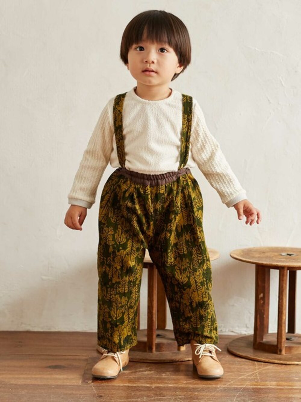 サスペンダーつきのゆったりしたシルエットのパンツ。(サスペンダーは取り外すこともできます。) 手描き風の森のイラストの中には、動物たちがさりげなくかくれんぼしています。 ユニークな配色で、コーディネートのポイントになるパンツです。