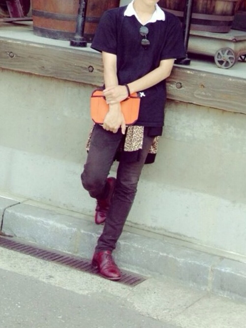 差し色コーデ🌞 白シャツ→古着 黒T→古着 革靴→アメ村近くピグスティ 丸メガネグラサン→不明 クラッチバッグ→忘れたʕ•̫͡•ʕ•̫͡•ʔ スキニー→UNIQLO