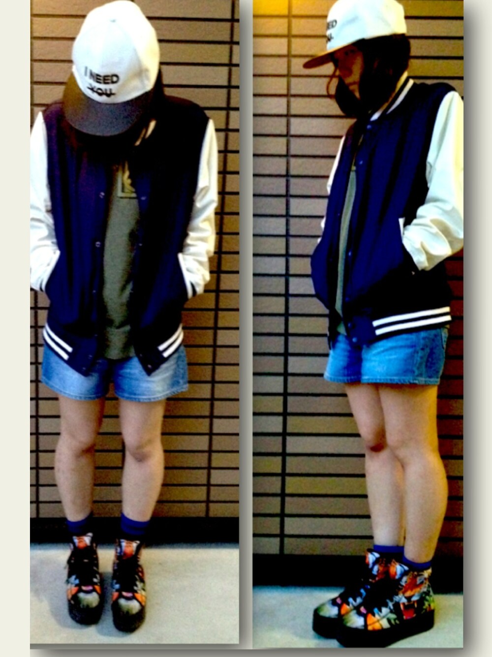 古着屋さんで一目惚れした厚底シューズとスタジャンをお気に入りのTシャツと合わせて♡ このキャップも素材が好きでお気に入り!! お花見楽しみだー! まだ散るの待っててくれ!(笑)