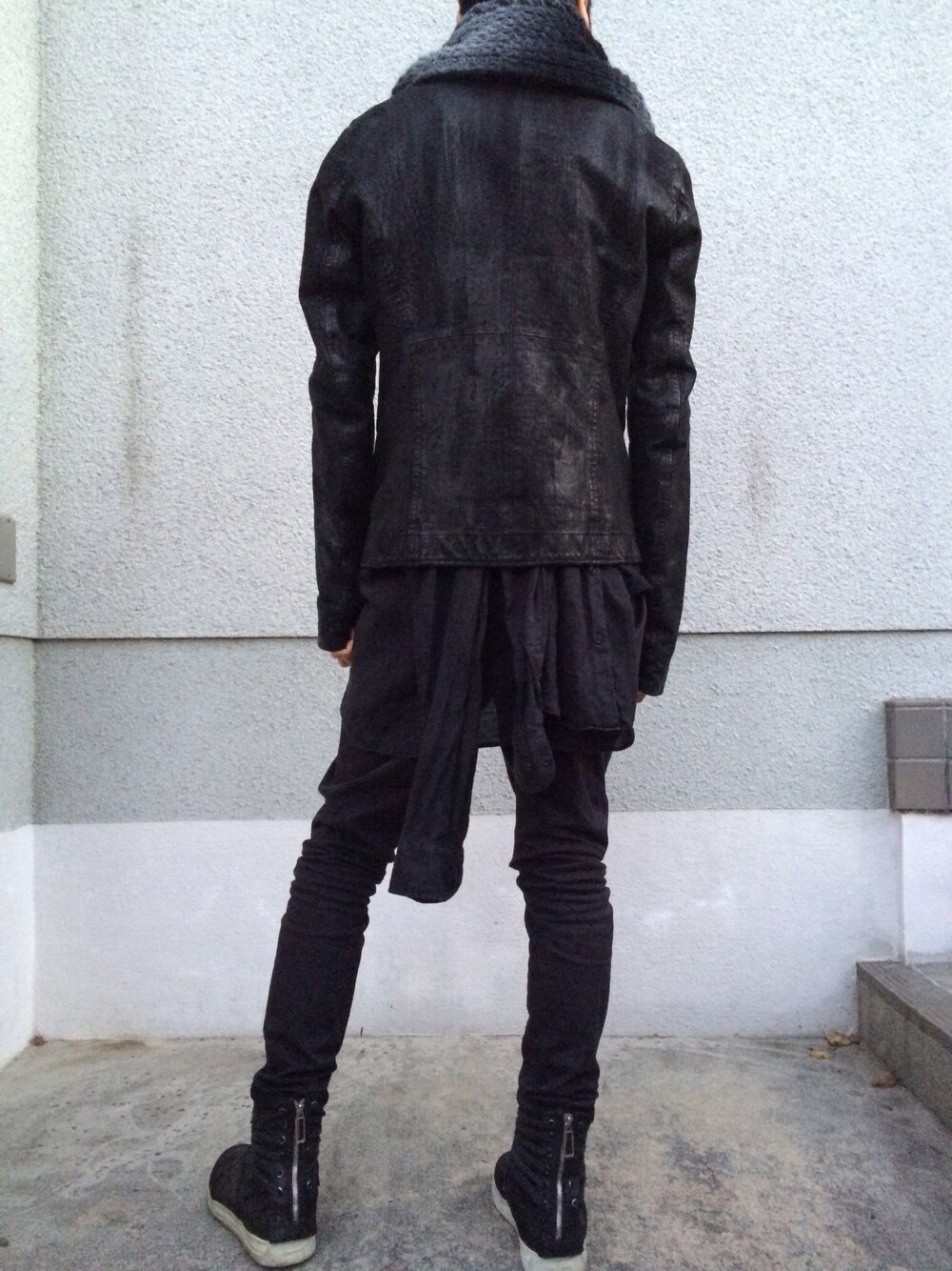 ブラック系のその他パンツ、ブラック系のブーツを着用したメンズの冬コーディネートの1枚目の写真