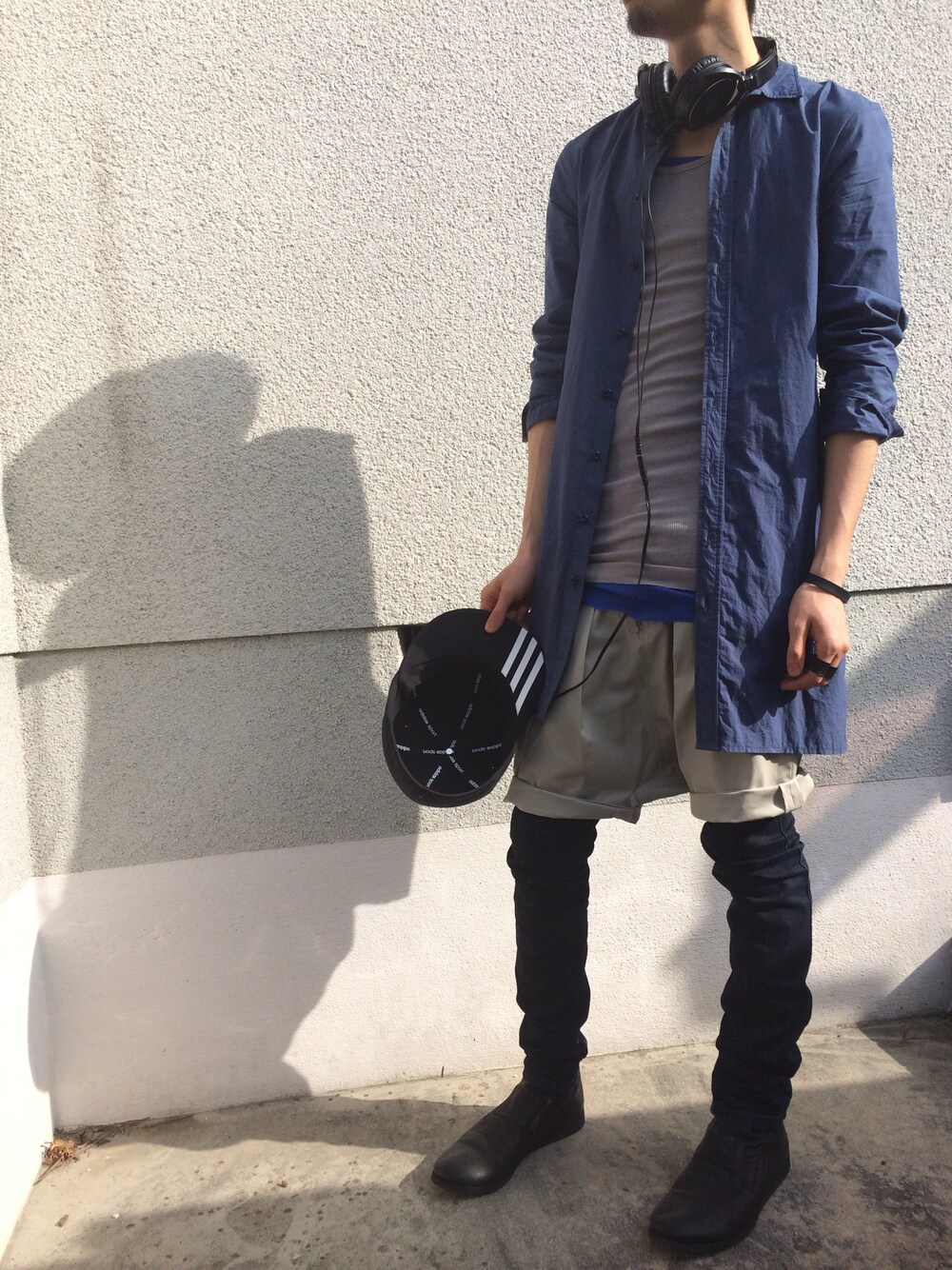 s/sシャツスタイル 春です roodのロングシャツとハーフパンツを履いてます