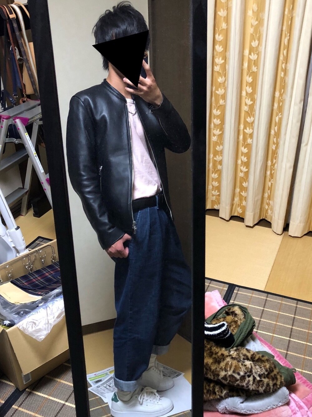 今年らすとライダースコーデです😢 春っぽくピンクのビック Tをタックインしてパンツはワイドデニムパンツをロールアップして組んでみました😊🌸 すこしシンプルなのでチェーンネックレスもつけてみました👍散らかったまま取ってしまいましたごめんなさい🙇♂️ いいね、セーブ、フォロー待ってます😳