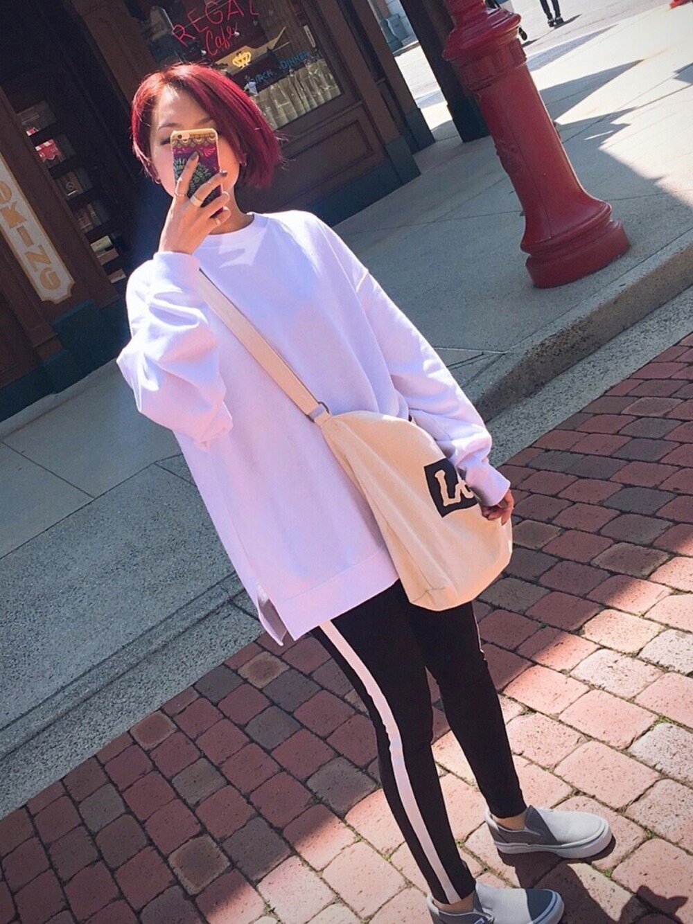 髪をバッサリ切って赤くしたら かなりいい感じにしっくりきたコーデ…❤︎ スウェット大好きラインパンツ最高← 念願のVANSも履き心地抜群でした