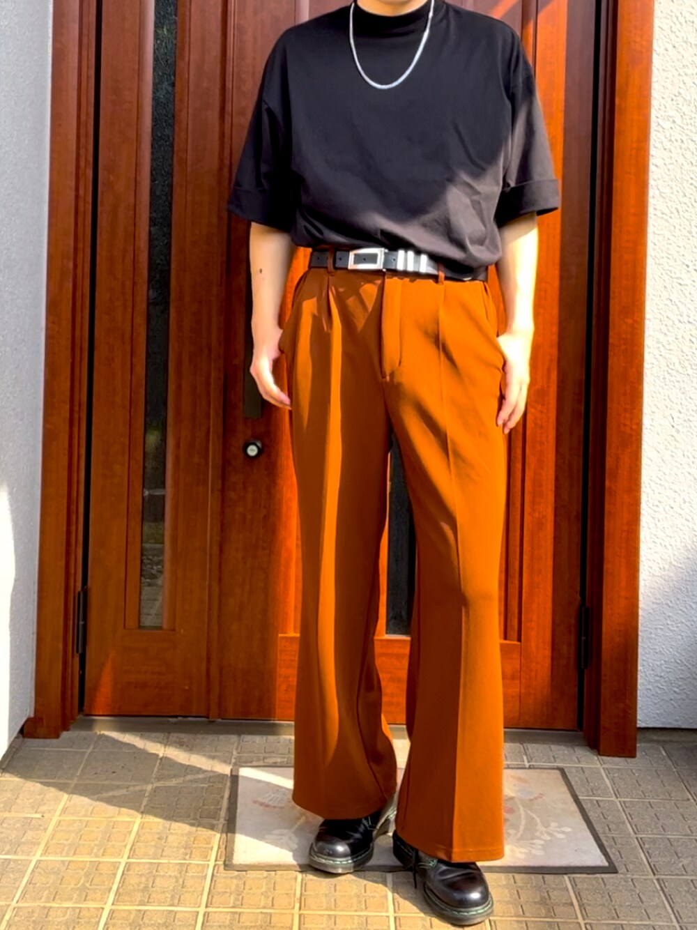 ご覧いただきありがとうございます☺️ そしていつもsave、いいねありがとうございます! 今回はシンプルに黒tシャツとブラウンのフレアパンツを合わせて見ました! adrerさんのベルトがあるとタッグインした時にかっこよく決まるのでマストです!