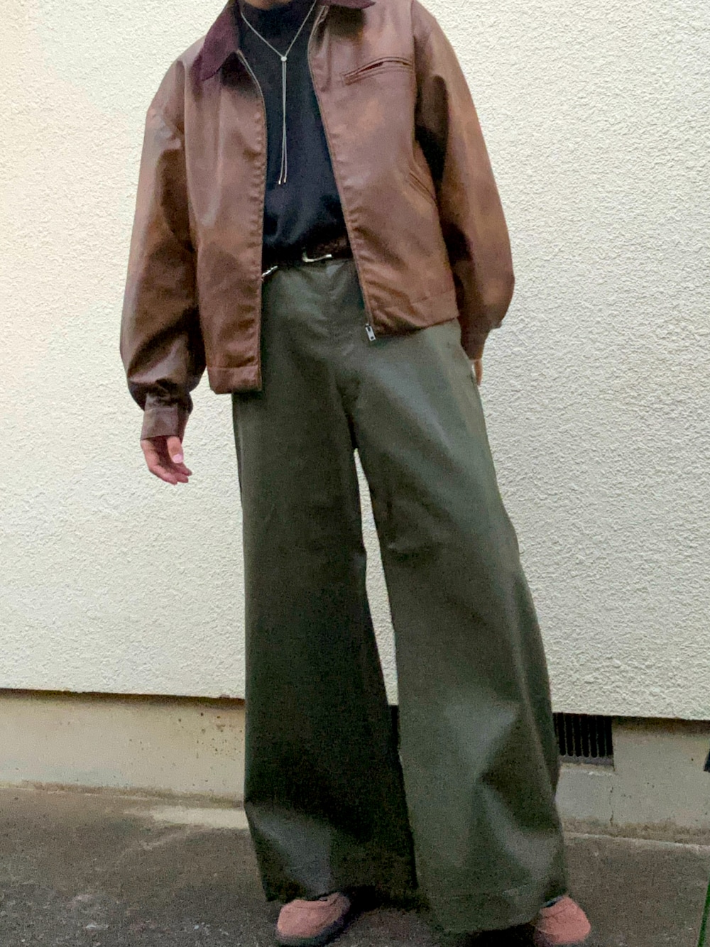 マルのライダースジャケット「VINTAGE LIKE SHORT JACKET /ヴィンテージライクショート合皮ジャケット」を使ったコーディネート