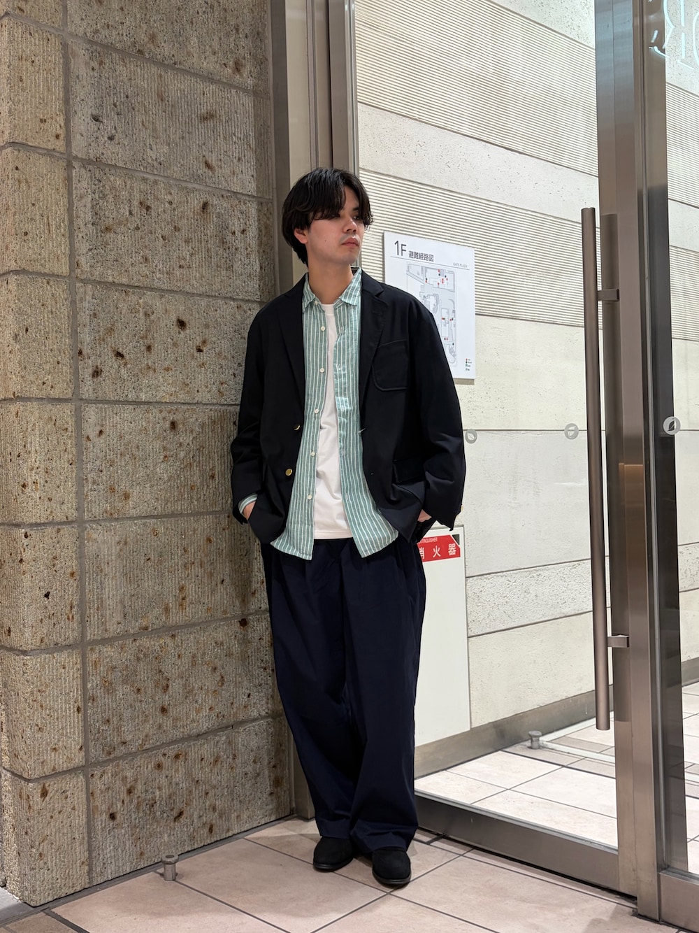 FORK&SPOONの新作アイテムを使ったコーデです! トップスはキレイ目ながらシャリっとしたパンツでやや外しも取り入れながら