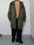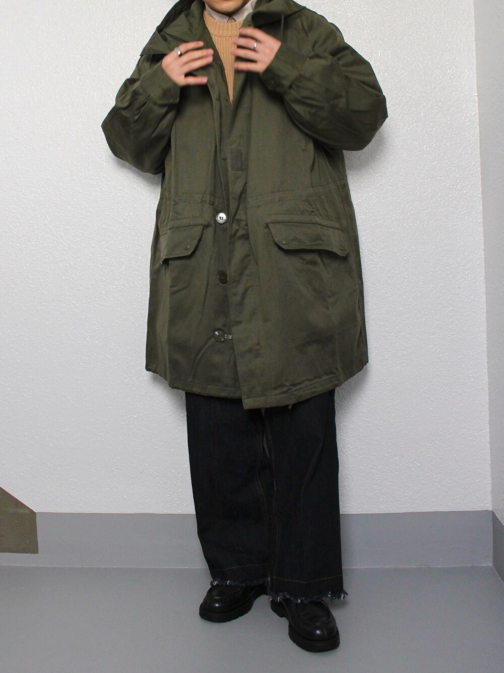 m-64を大人のカジュアルスタイルでコーデ組んでみました☺️ m-65よりもシルエットが 細身に作られていて少し上品なイメージ。 それにワイドシルエットのデニムを合わせて革靴で締めるとバランスよいカジュアルコーデになります!