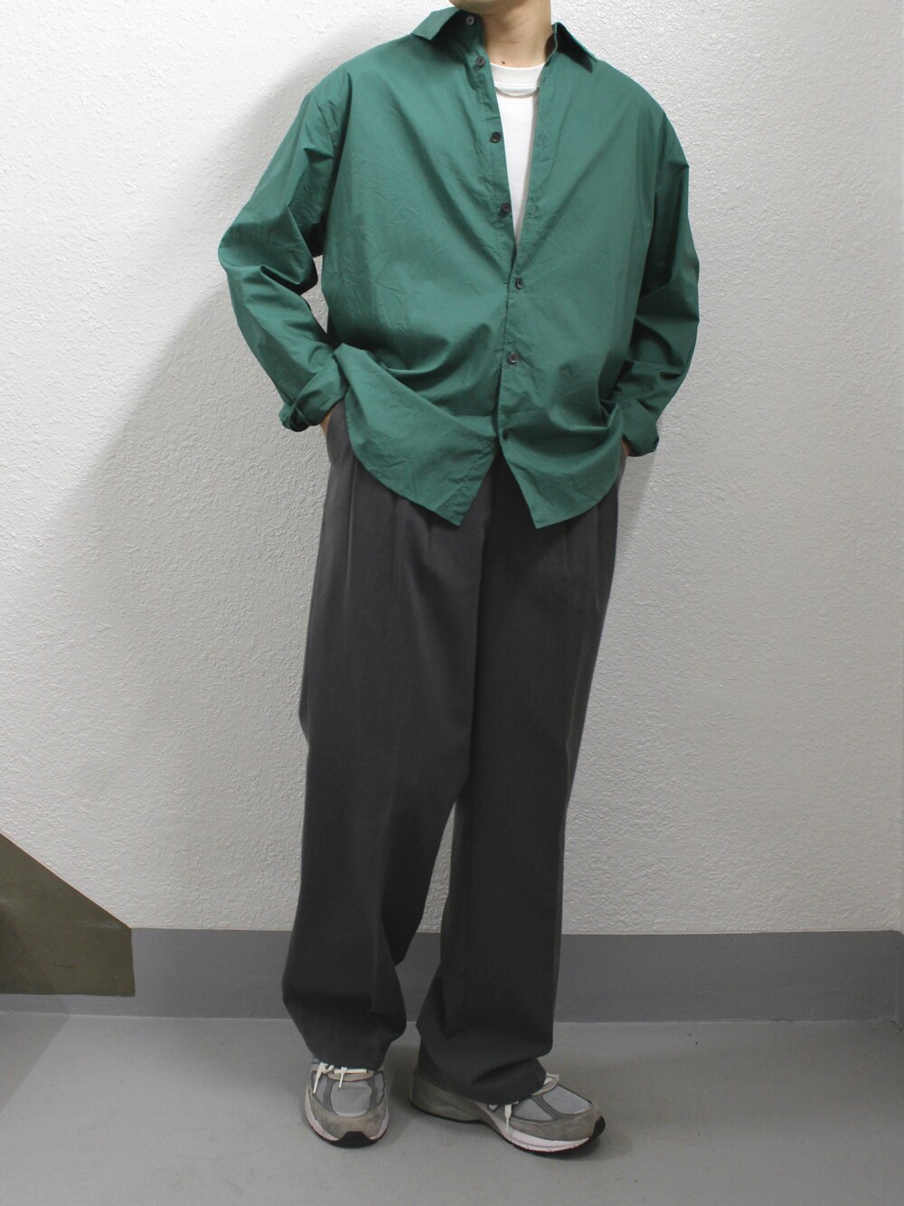 ●大人のリラックススタイル グリーン×グレーで 大人っぽい落ち着いたスタイリングに🌿 固くなり過ぎないよう シャツのインナーには白Tをチラ見せし シルバーのネックレスをアクセント◎ 足元はリラックスな雰囲気になるよう 同色のグレーのニューバランスを合わせました🐘