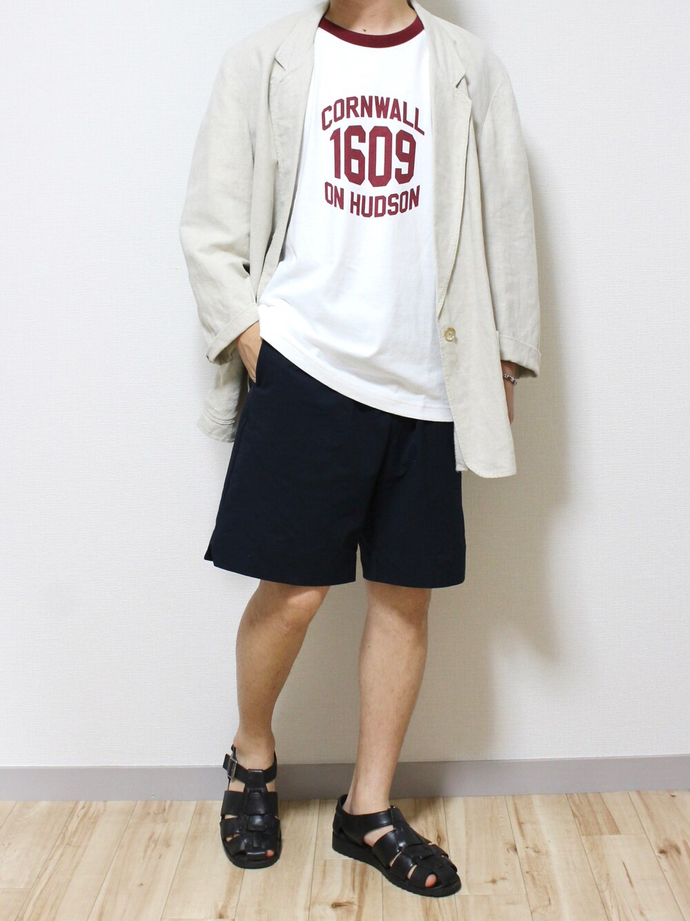 ●UTコーデ UNIQLOのリンガーTシャツをインナーに リネンジャケットとショートパンツを合わせた夏のジャケットスタイル🙆♂️ このリンガーTシャツは値段も1,500円でプリントも良い感じでとても気に入ってます◎