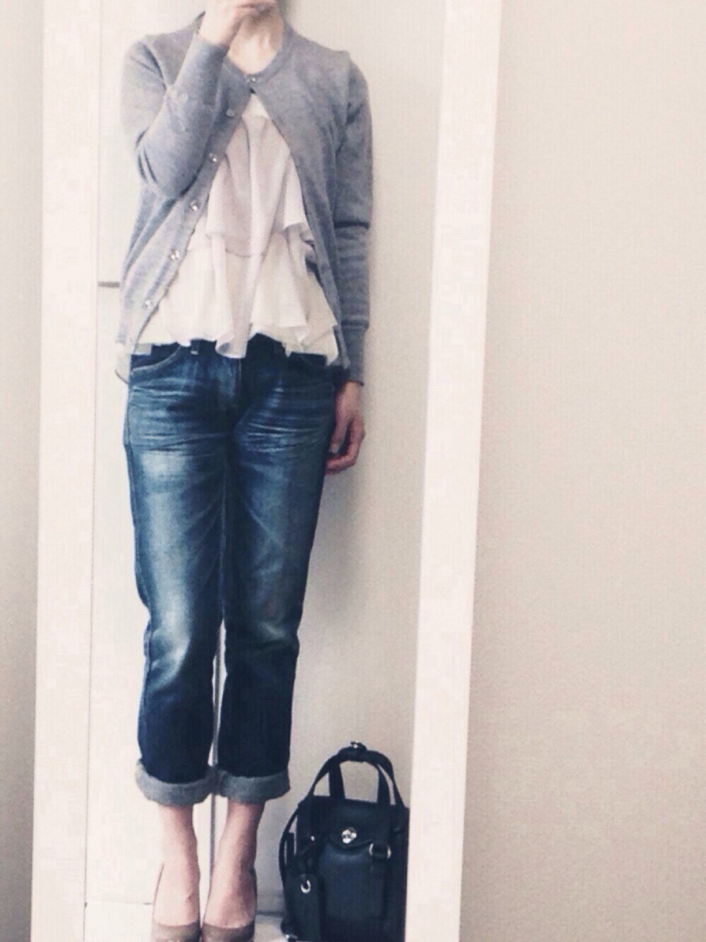 黒大好きな私、今回は珍しく服に黒がないっ‼️バックだけ‼️ 春に近づいてきたので明るい色でまとめました🌸 中に着てるベージュのシフォンはキャミなのでもう少し暖かくなったら見せて着たいなっ✌️ 見づらいのですが、カーディガンのボタンがシルバーなのがポイントです😄