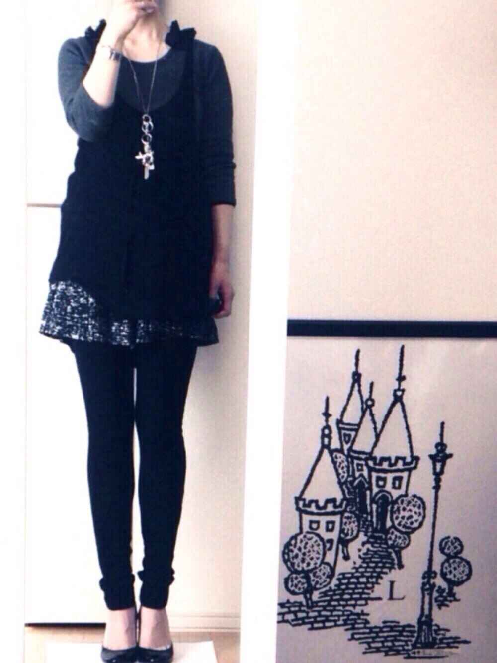 モノトーンシンプルコーデ‼️ ちょっと昔に購入したe.m.のキーホルダーをネックレスにして使ってます✨ピカピカしてて存在感があって気に入ってます🐖❤️ 肩のひらひらも気に入ってます😄