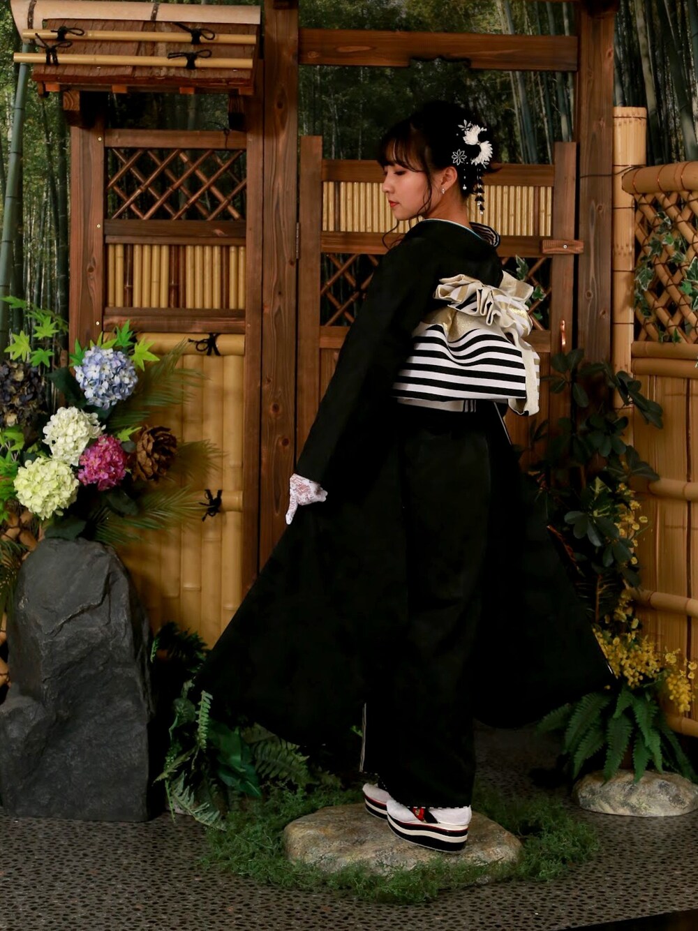 ブラック系の着物を着用したレディースの秋コーディネートの1枚目の写真