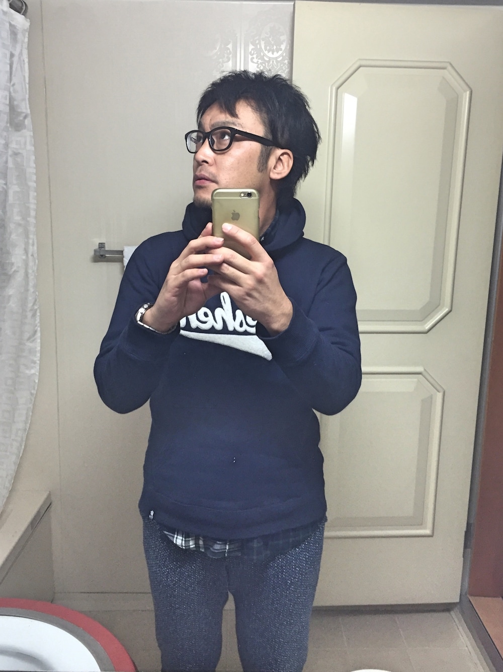 パーカー×ネルシャツ×フリースパンツのコーデ。