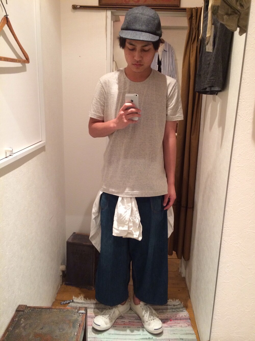 今日の私服です 古着の太いランチパンツに ohtaのグレーのカットソーで 薄手のシャツを腰に巻き 春夏らしさを出す為に ジャックパーセルで