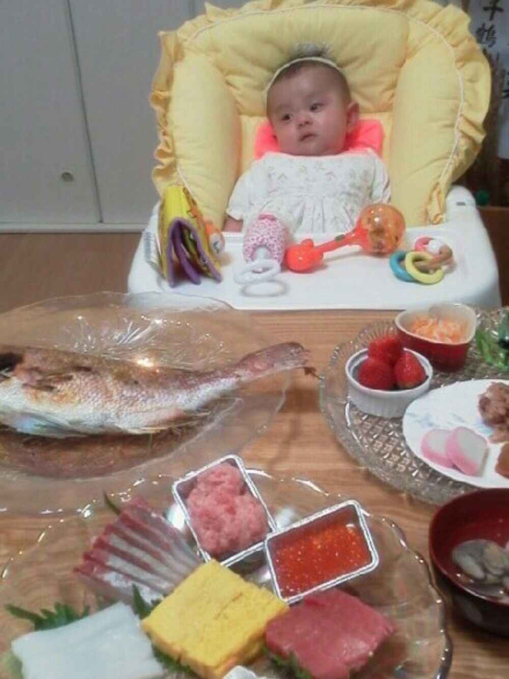 マールマールの可愛いエプロンでお食い初めコーデ♡ が、、眠くていいお顔撮れずこの表情w