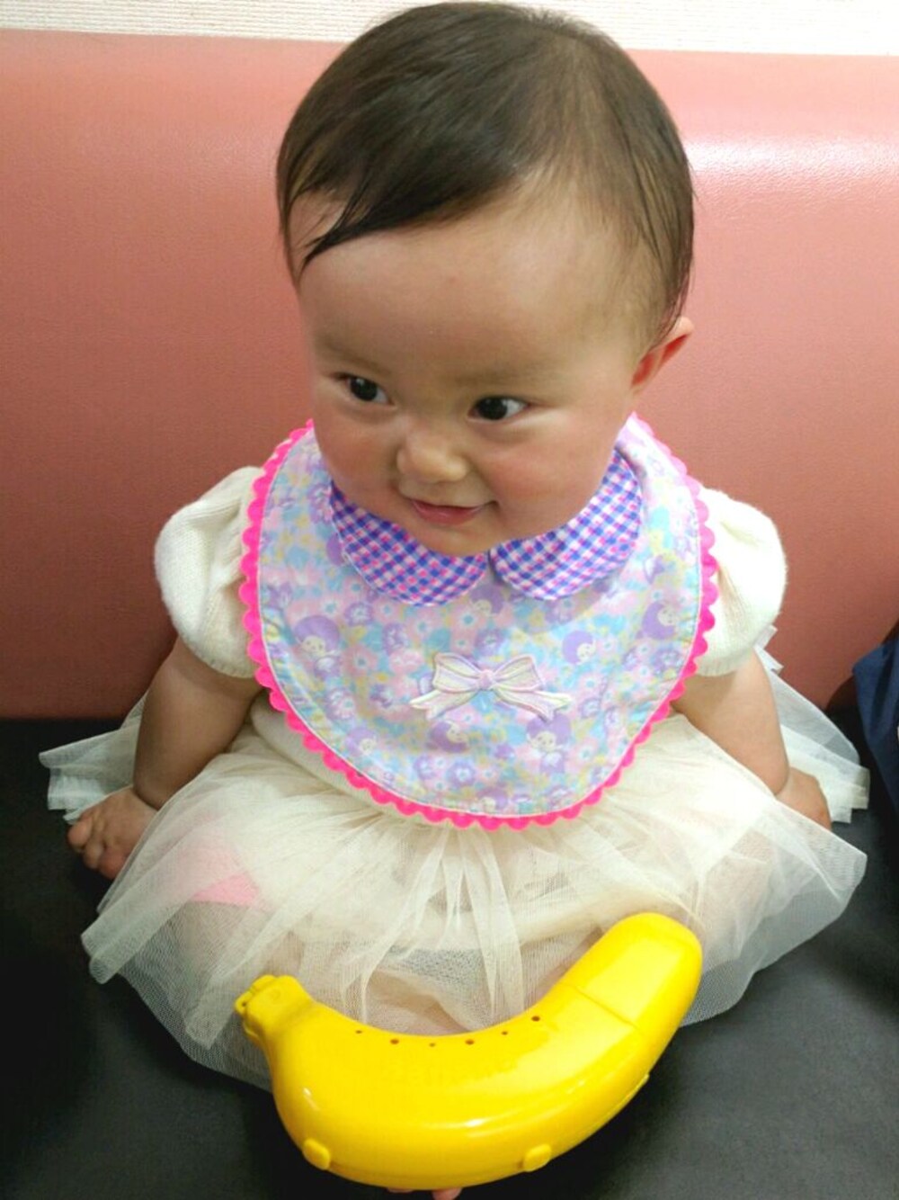 バナナデビューしました🍌 ギャップの人気の白のチュチュワンピはお祝いやフォーマルな席でも大活躍✨ これを着ていると必ず可愛いと褒められます❤