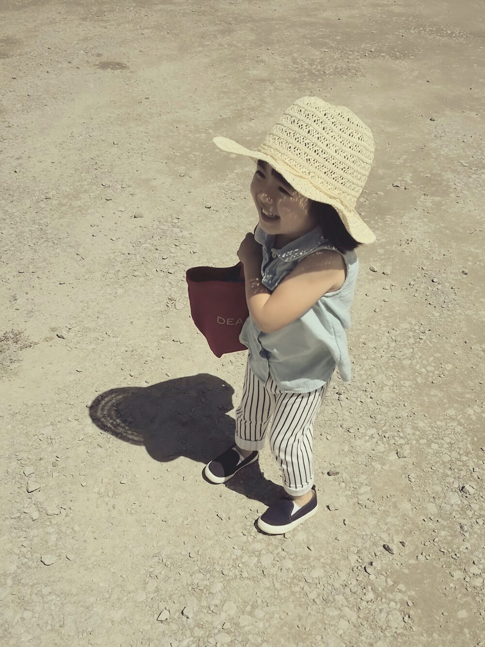 お祭りコーデ♡ 今日は近くの養鶏場でお祭り! 暑いからノースリーブ シャツに麦わら帽子で💕
