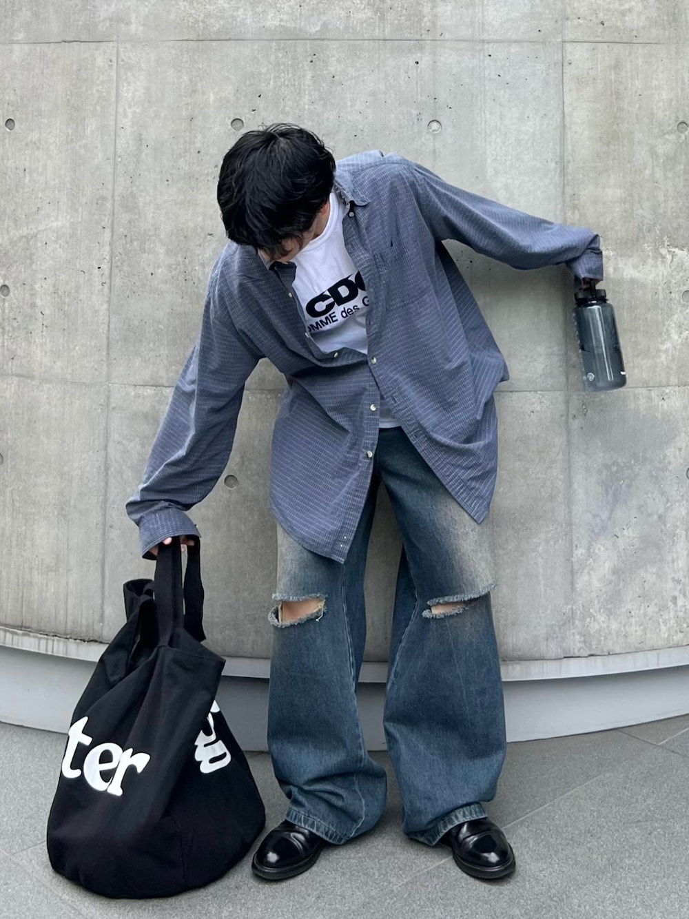 日焼けがしたくない!でも暑いのも嫌だ! そんな時に僕はこんなコーデ組みます🥣 インナーはTシャツで、アウターには薄めのシャツを、パンツはダメージデニムを選ぶことで、涼しいのにカッコよくキマります!! 色味はブルーにすると涼しげな印象になるので ぜひ試してみてくださいー!✌🏻