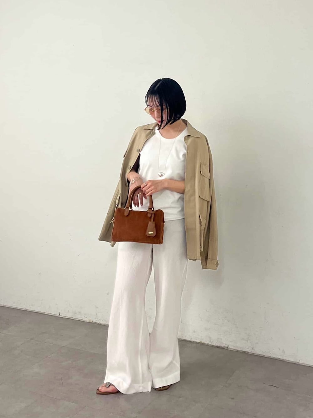 オールホワイトコーデに差し色でブラウンスエード◎ 夏だからこそスエードバッグを持って、周りと差をつけてオシャレを楽しみたいです!