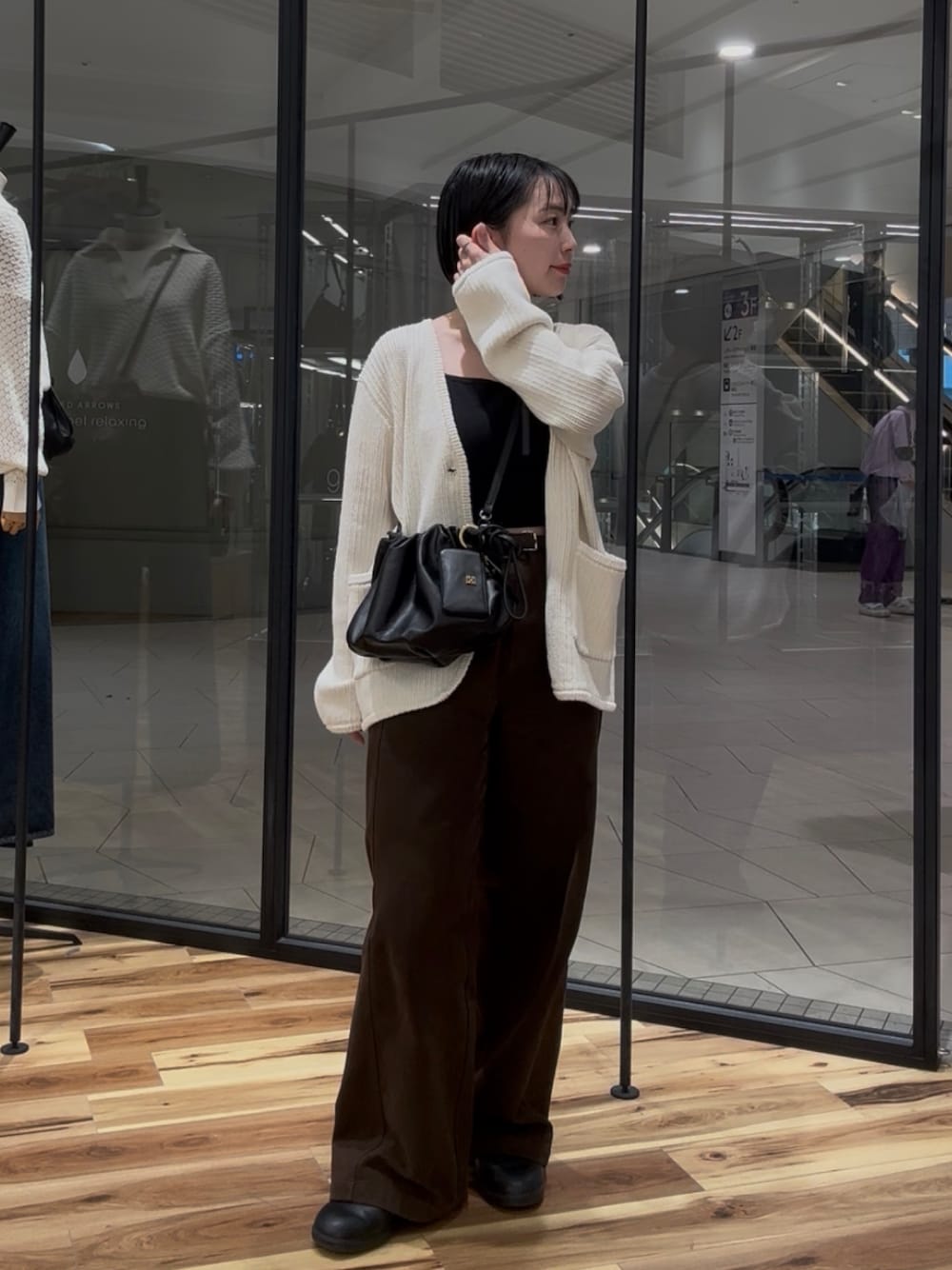 大人カジュアルでちょっと女性らしさも出したかったのでニットカーディガンにレザー巾着バッグを合わせました!