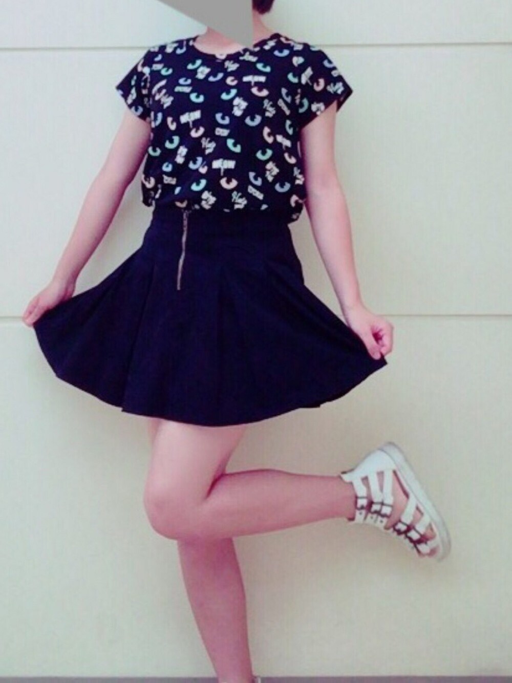 服着た 猫の目が沢山ついてるの ブラックコーデ