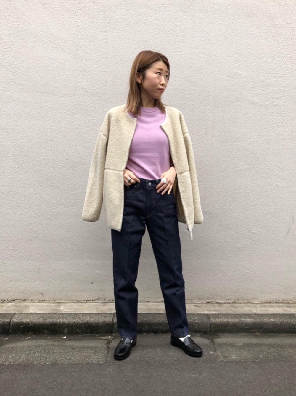 身長:164cm 普段のサイズ:トップスS パンツS/M シューズ23・23.5cm 【サイズ感】 アウター:着丈が長めで全体的にゆったりとしたサイズ感です。 トップス:程よくゆったり デニム:足首にかけてスッキリとしたシルエットです。丈感が欲しかったのでMサイズで着用しました。 シューズ:標準的・馴染むまで革がやや硬めです。 【素材感・着心地】 トップス:カシミヤ素材で肌触りが柔らかいです。手洗い可能なのも嬉しいポイントです。 デニム:馴染みのいい素材感でとても履きやすいです。ややハイウエストにお召し頂けるので美脚効果抜群の1着です。 【コーディネートポイント】 ライラックカラーが目を惹くニットを主役にスタイリングを組みました。1枚で着映えするカラーニットはこの時期に持っていて間違いない一押しのアイテムです!