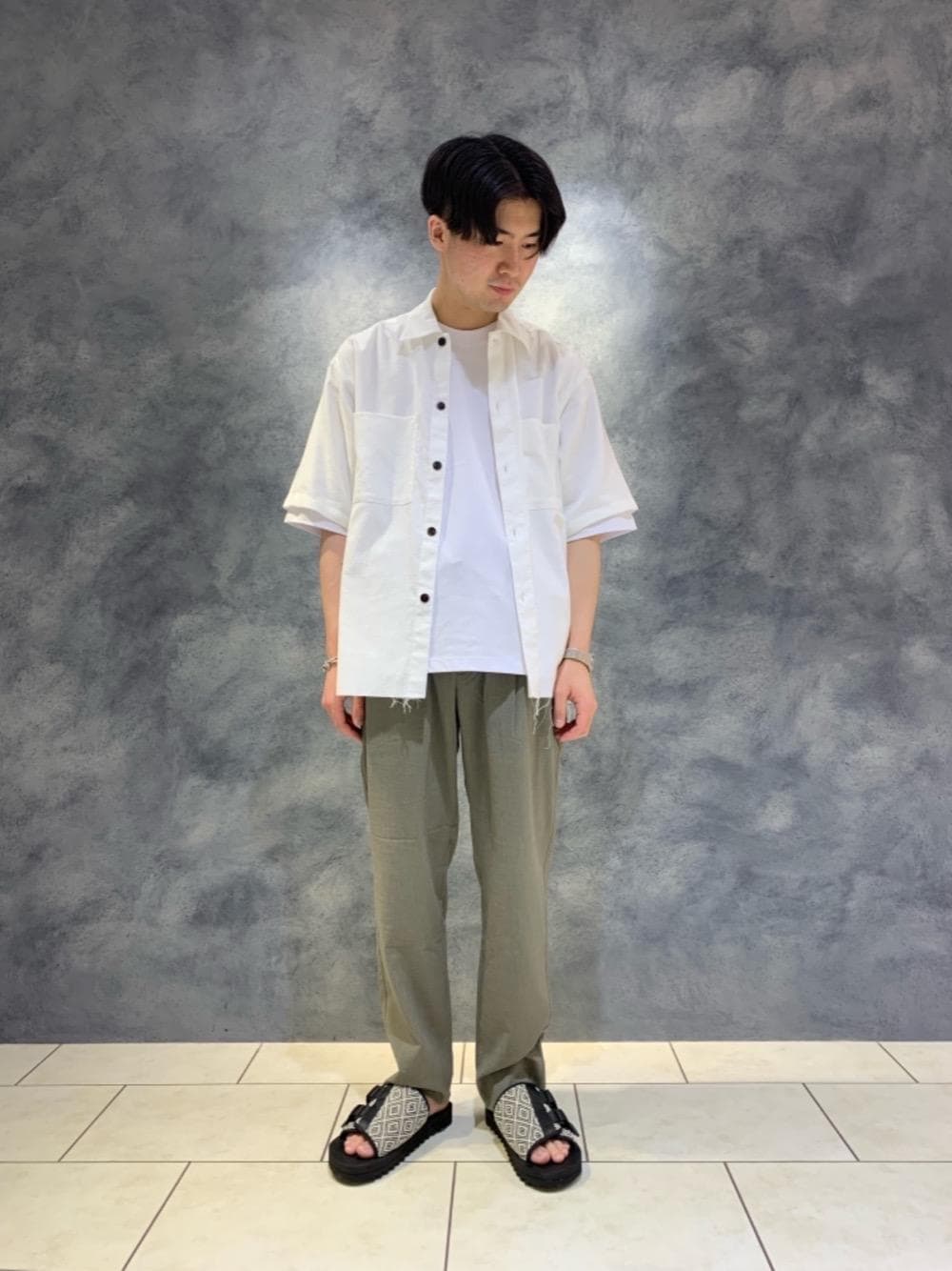 【身長】177㎝ 【普段サイズ】 アウターL ボトムスL/32inchシューズ27.5㎝ 【サイズ感】 トップス ややゆったり ボトムス 標準的 シューズ ややゆったり インナーも白で合わせたトップスに淡いオリーブのパンツを合わせることで、柄物サンダルが派手に見え過ぎないようなスタイリングを意識しました。
