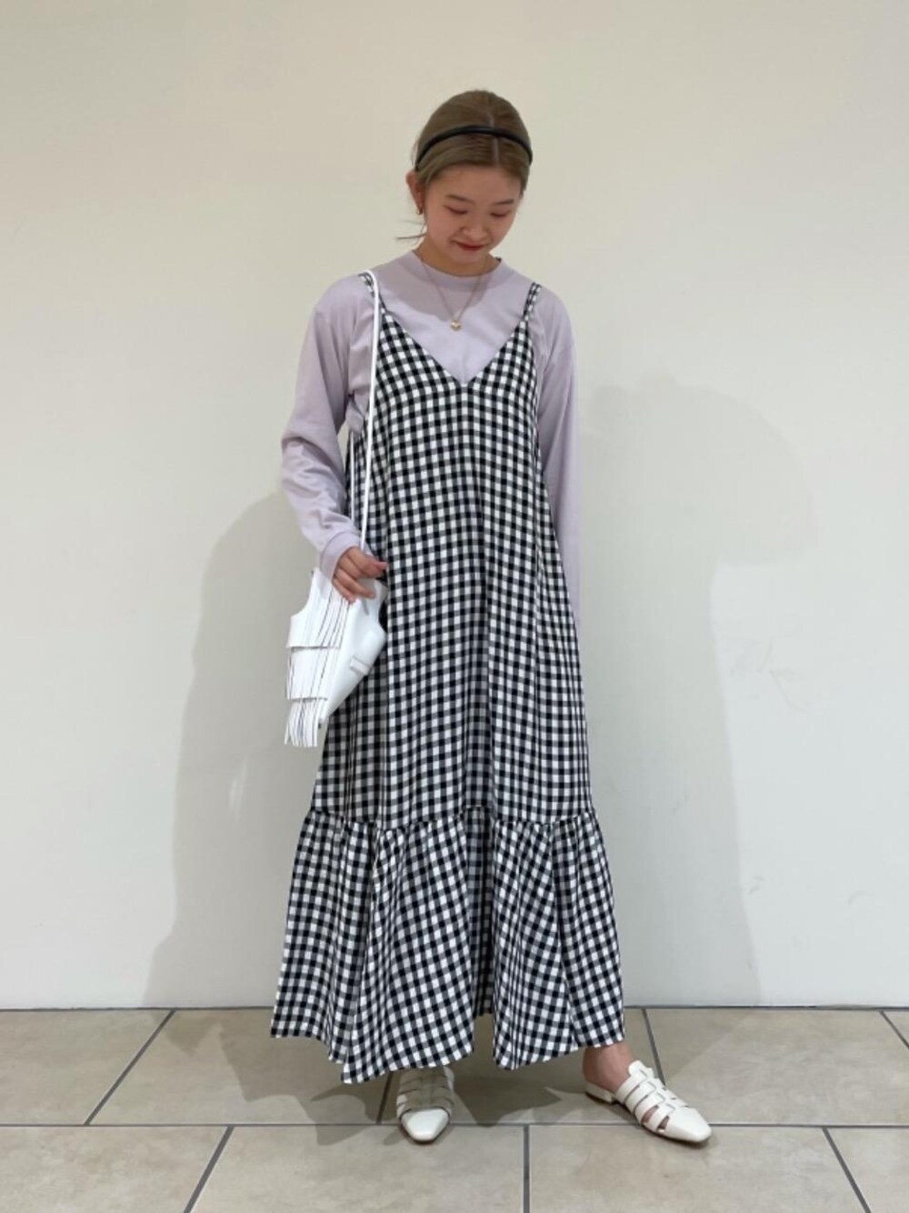 モノトーンのギンガムチェックはどんなお色とも合わせやすく、グッと春らしくなるアイテムです◎ ラベンダー色のトップスはメンズ物ですが程よいゆるさと肌触りのよさで女性も差し色インナーとして取り入れやすいアイテムです!