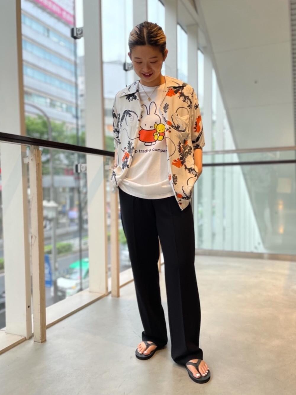 ・身長:165cm/肩周りも肉付きのいい骨格ウェーブ ・足のサイズ:24cm/幅広め/甲ふつう 【サイズ感】 トップスはゆったりしたサイズ感ですが肩は落ちないデザインです。 シャツはジャストサイズで着ていただけるシルエットです。 パンツは腰回りは体に沿うラインでややワイドシルエットで膝下はストレートです。裾が長めです。 【素材感】 シャツはレーヨンならではの柔らかくとろみのある素材です。 パンツはシワが付きにくく少し厚手なので体のラインを拾いにくいです。 【着心地】 パンツはかなりストレッチが効いていてはき心地がとても良いです。 【コーディネートポイント】 <POP TRADING COMPANY >のミッフィーTシャツと<KONABAY HAWAII>の別注シャツの色をリンクさせてみました。アロハシャツはユニセックスで着られる代表的なアイテムですので是非女性にも取り入れて頂きたいです!