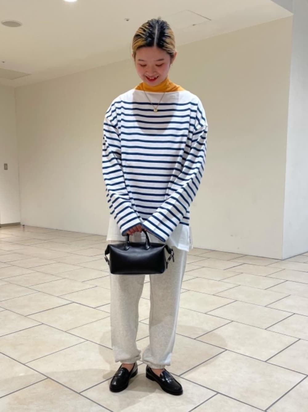 ・身長:165cm/肩周りも肉付きのいい骨格ウェーブ ・足のサイズ:24cm/幅広め/甲ふつう 【サイズ感】 ボーダーカットソー:メンズの中でもゆったりめです パンツ:ゆったりとしたシルエットで裾が長めです シューズ:幅がやや細めですがサイズをあげる程ではないです 【素材感】 カットソー:ザラっとしたドライな質感で肉厚です パンツ:柔らかく、やや薄手のスウェット地です 【着心地】 インナー:非常に伸縮性があります 【コーディネートポイント】 先シーズンから人気のバスクボーダーシャツは思い切ってオーバーサイズを選んでみました!スウェットパンツで合わせて楽ちんですが、小物で引き締めてバランスをとりました。