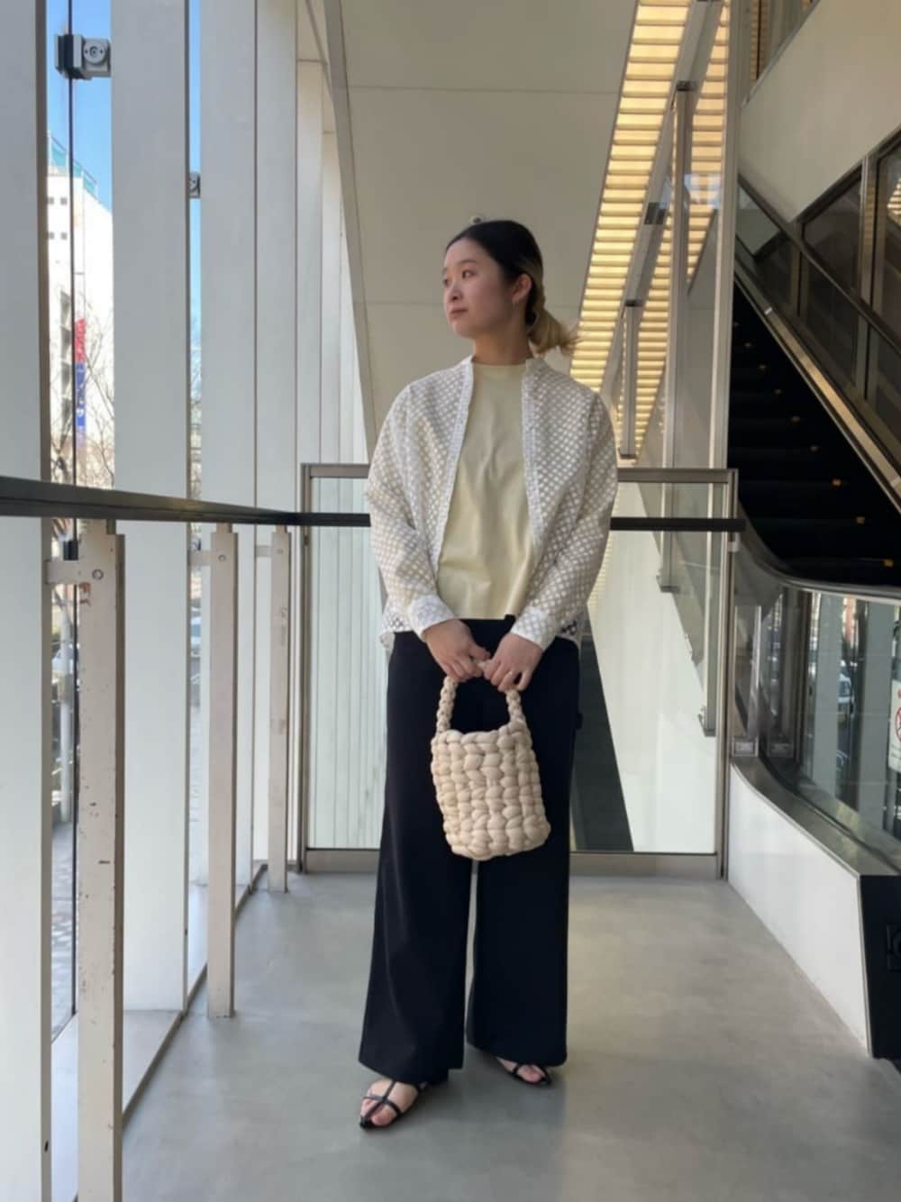 【サイズ感】 シャツ:少しゆったりで着丈が短いです トップス:ゆったりめです パンツ:少しゆったりめです シューズ:標準です 【コーディネート】 やわらかく春らしいクリーム色と透け感のあるシャツで軽やかにまとめました。