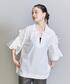【サイズ感】 ブラウス:ゆったりめです パンツ:ゆったりめです シューズ:標準です 【コーディネートポイント】 デザイン性のあるブラウスを主役にシンプルにコーディネートしました。