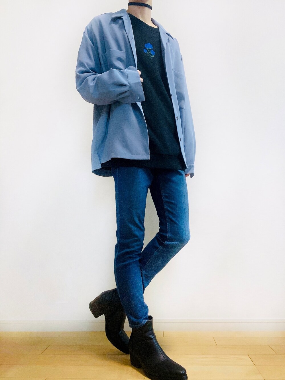 ご覧いただきありがとうございます😊 本日は青を全面に意識したコーデになります! 青薔薇のワンポイント模様があることでシンプルから頭一つ出てきた感じです! 今回もチョーカー+ブーツでユニークさを出しています!ドクターマーチン風の靴でもとっても良く似合います。 気に入ってくれたらいいね、コメントお願いします🤲 フォローしてくれると嬉しいです😊