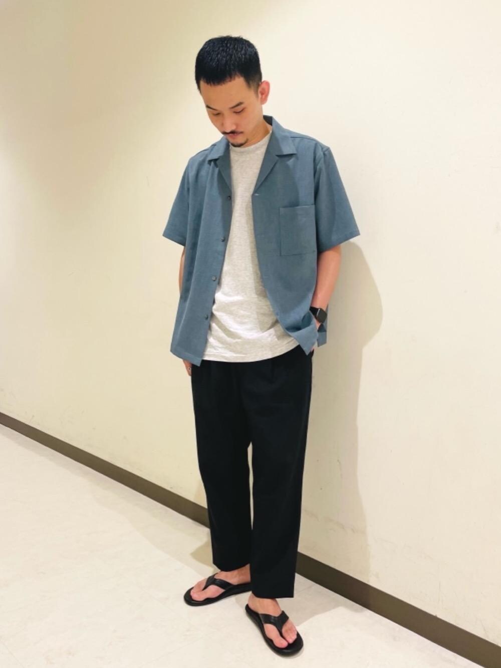■年齢:20代半ば ■身長:174cm ■体重:63kg ■体型:痩せ型 ■普段サイズ:トップスL/ボトムL/シューズ26.5cm 【サイズ感】 シャツ:ややゆったり パンツ:ややゆったり 【素材感】 シャツ:リネンのようなドライタッチな風合い パンツ:肌離れの良い表面がややザラついている生地 【コーディネートのポイント】 シンプルなアイテム使いですが ペールトーンのブルーを使うことで こなれた雰囲気にしておりす