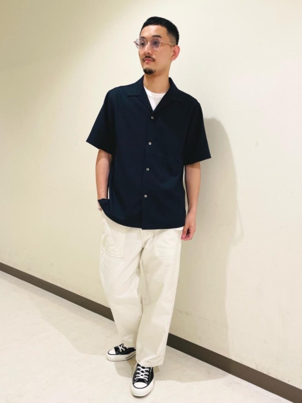 ■年齢:20代半ば ■身長:174cm ■体重:63kg ■体型:痩せ型 ■普段サイズ:トップスL/ボトムL/シューズ26.5cm 【サイズ感】 シャツ:ややゆったり パンツ:ややゆったり 【素材感】 シャツ:ややザラッとしていて肌離れが良い パンツ:ハリがあり、立体感がある 【コーディネートのポイント】 爽やかな色づかいと開襟シャツのイメージで季節感のあるコーディネートにしました。