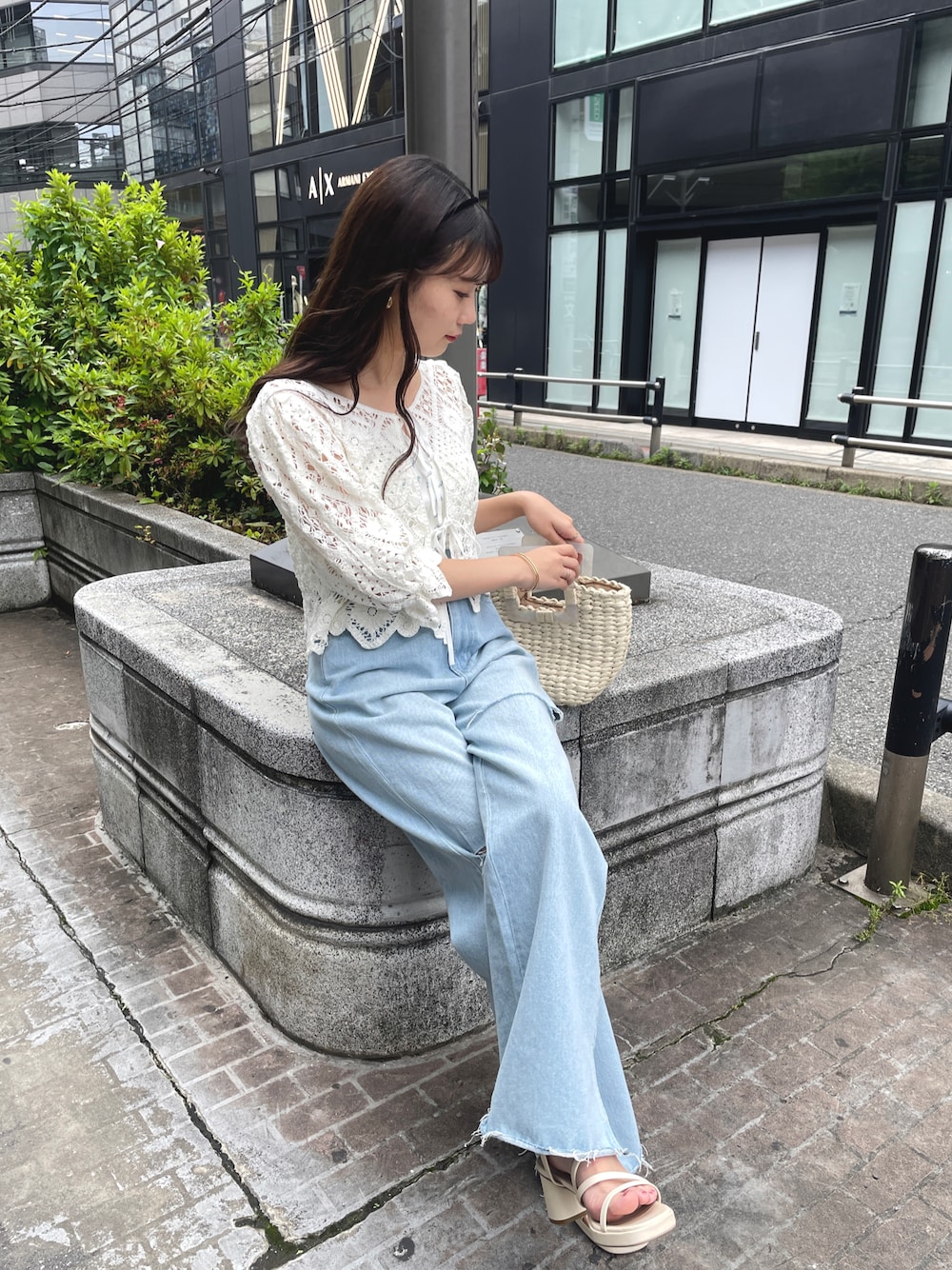 トップスの編みデザイン可愛い🫧 トップスとしても前のリボン開けて羽織りでも使えるの嬉しい! デニムは今年人気のダメージが入ったタイプです! ナイスクラップのは裾を切って自分の好きな丈感にできるので万能🫶🏻