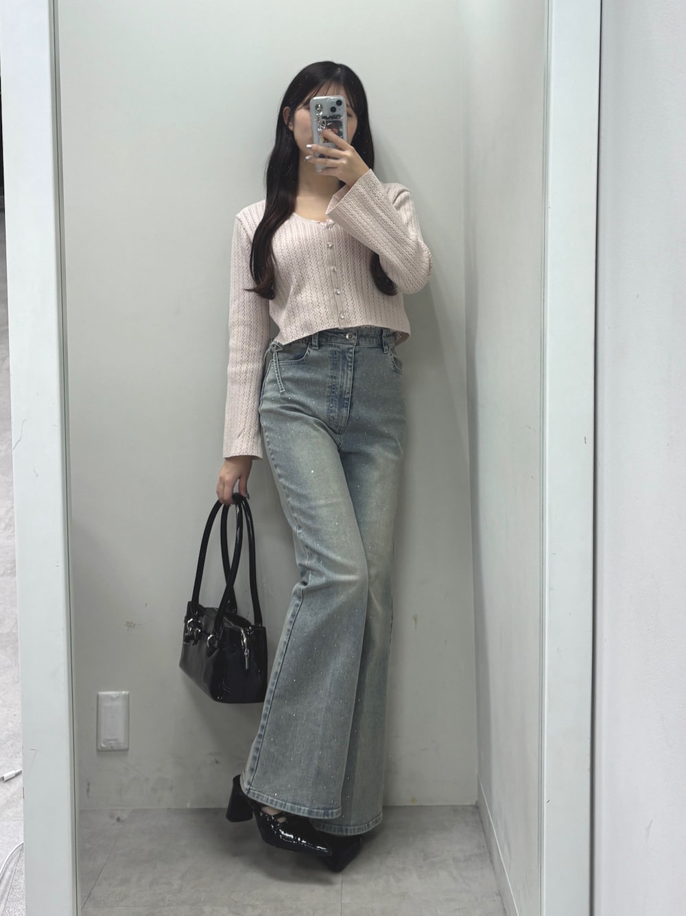 おはな(one after another NICE CLAUP)のデニムパンツ「【選べる4サイズ展開】サイドカット美脚ビジューデニムパンツ」を使ったコーディネート