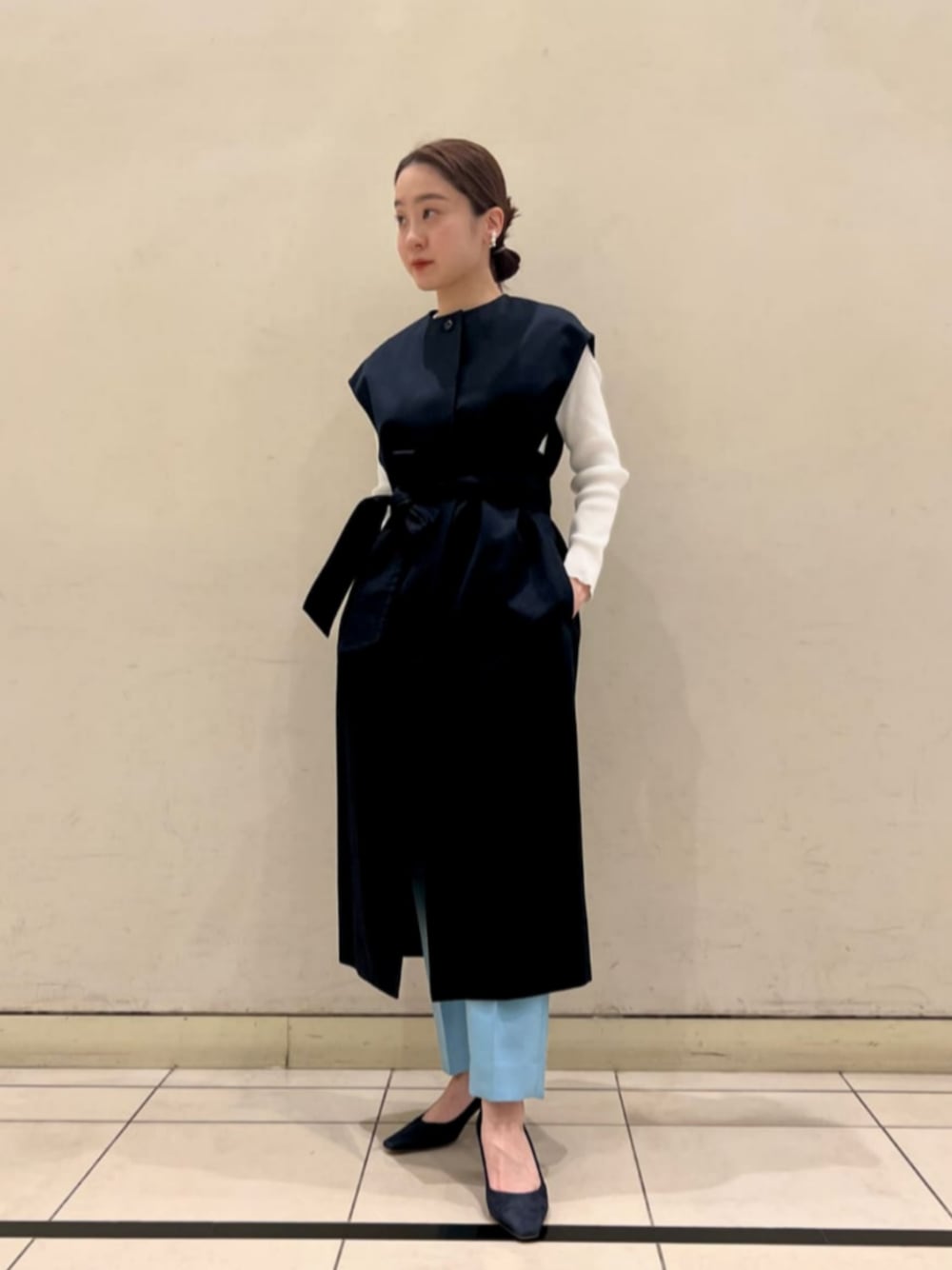 [サイズ感] ニット:ややフィット感有り ベスト:ゆとり有り パンツ:標準的 [コーディネート] ハリ感のあるボックスシルエットが印象的なジレ。ややボリューム感がある為、細みのカラーパンツでメリハリを出しました。