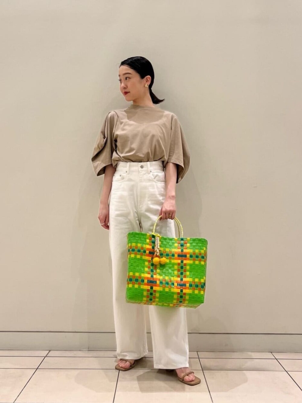 【サイズ感】 カットソー:標準的 デニム:腰回りややフィット感有り(34サイズ着用) 【コーディネートポイント】 袖のデザインが印象的なカットソーにややハイウエストのデニムを合わせてメリハリをつけました。ベージュカラーが上品な雰囲気を作ります。鮮やかななカゴバッグで夏らしさをプラスしました。