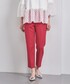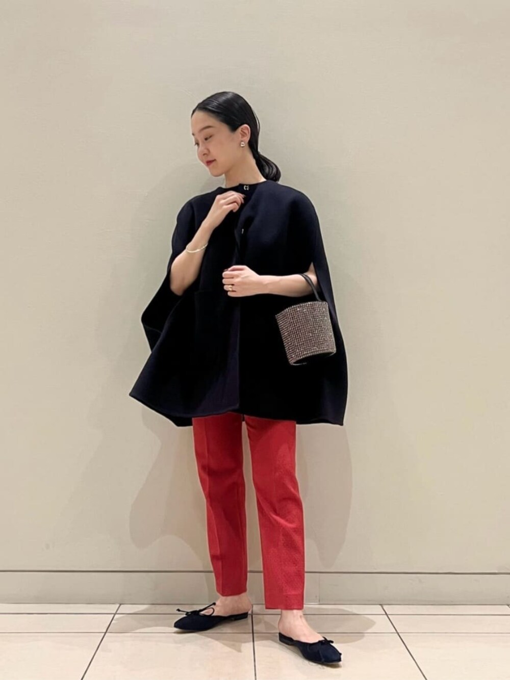 【サイズ感】 カットソー:標準的 アウター:ややゆとり有り(36サイズ着用) パンツ:ややフィット感有り(36サイズ着用) 【コーディネートポイント】 ピンクの鮮やかなカラーパンツを主役に 他はネイビーで統一した綺麗めスタイル。 キラキラバックで遊び心をプラスしました。
