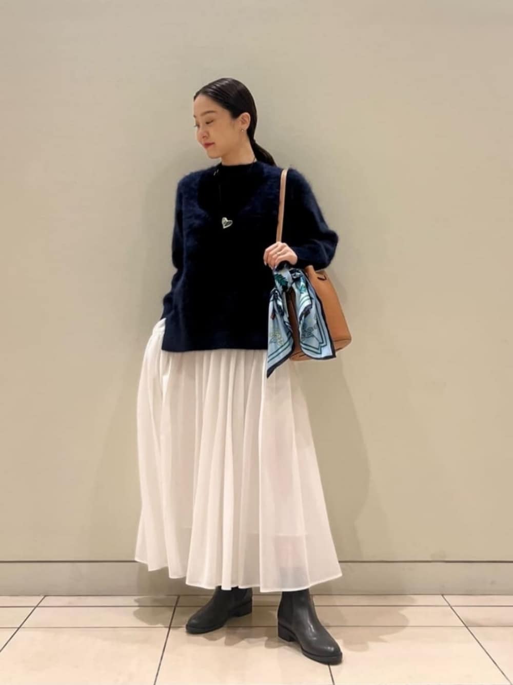 【サイズ感】 ニット:標準的 スカート:標準的 【コーディネートポイント】 軽やかな白のプリーツスカートに紺のニット合わせで、コントラストを効かせたコーディネート。白のアイテムは秋冬のコーディネートを一気に華やかに見せてくれます。