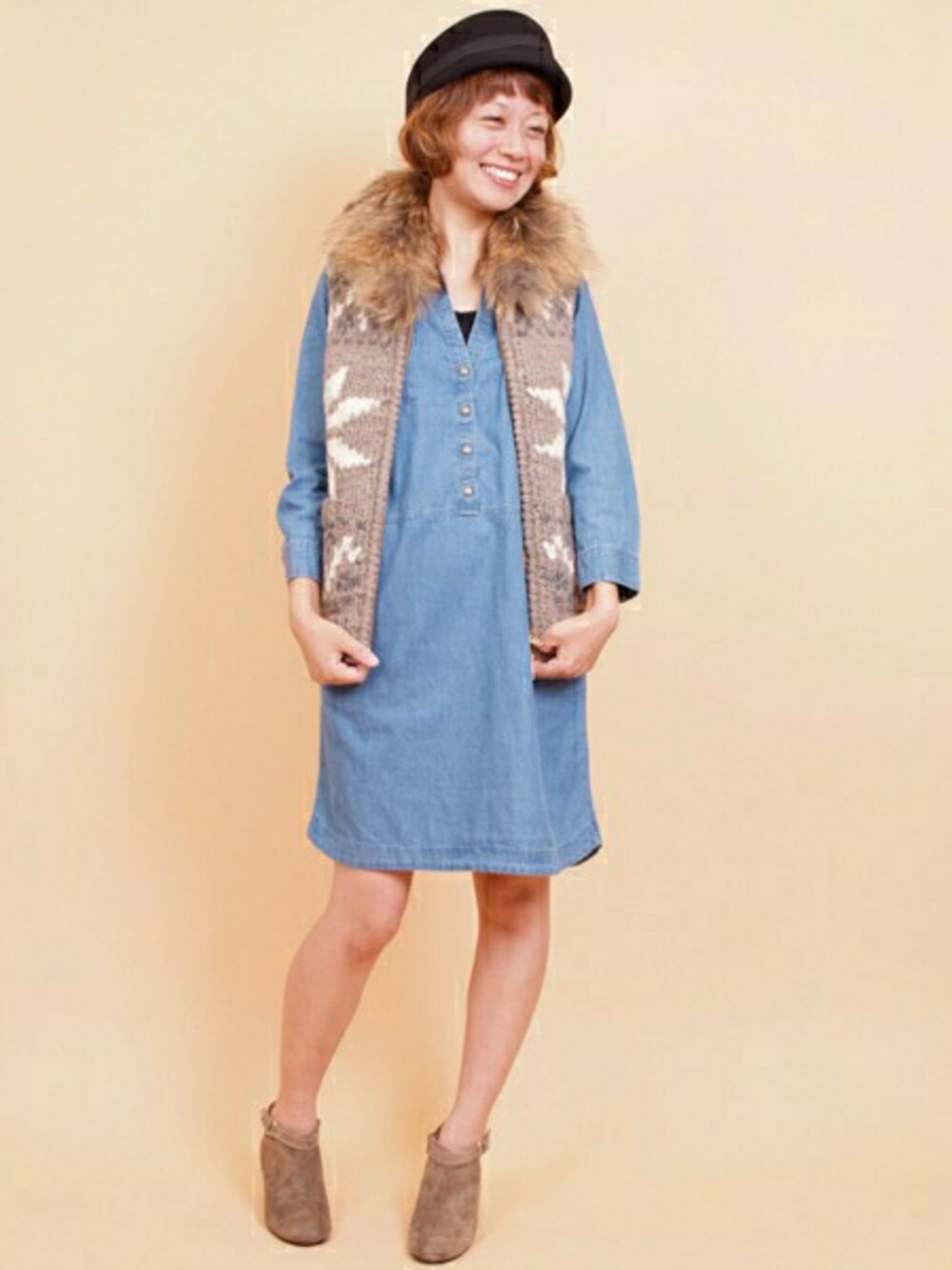 秋らしさを演出する可愛いファーカウチンベスト。ファーも取り外せるので、シャツ×デニムの組み合わせやTシャツの上から羽織ったり、今すぐにコーディネートに取り込めます。定番人気のデニムワンピースと合わせて女の子らしいカジュアルなスタイリングにしました。