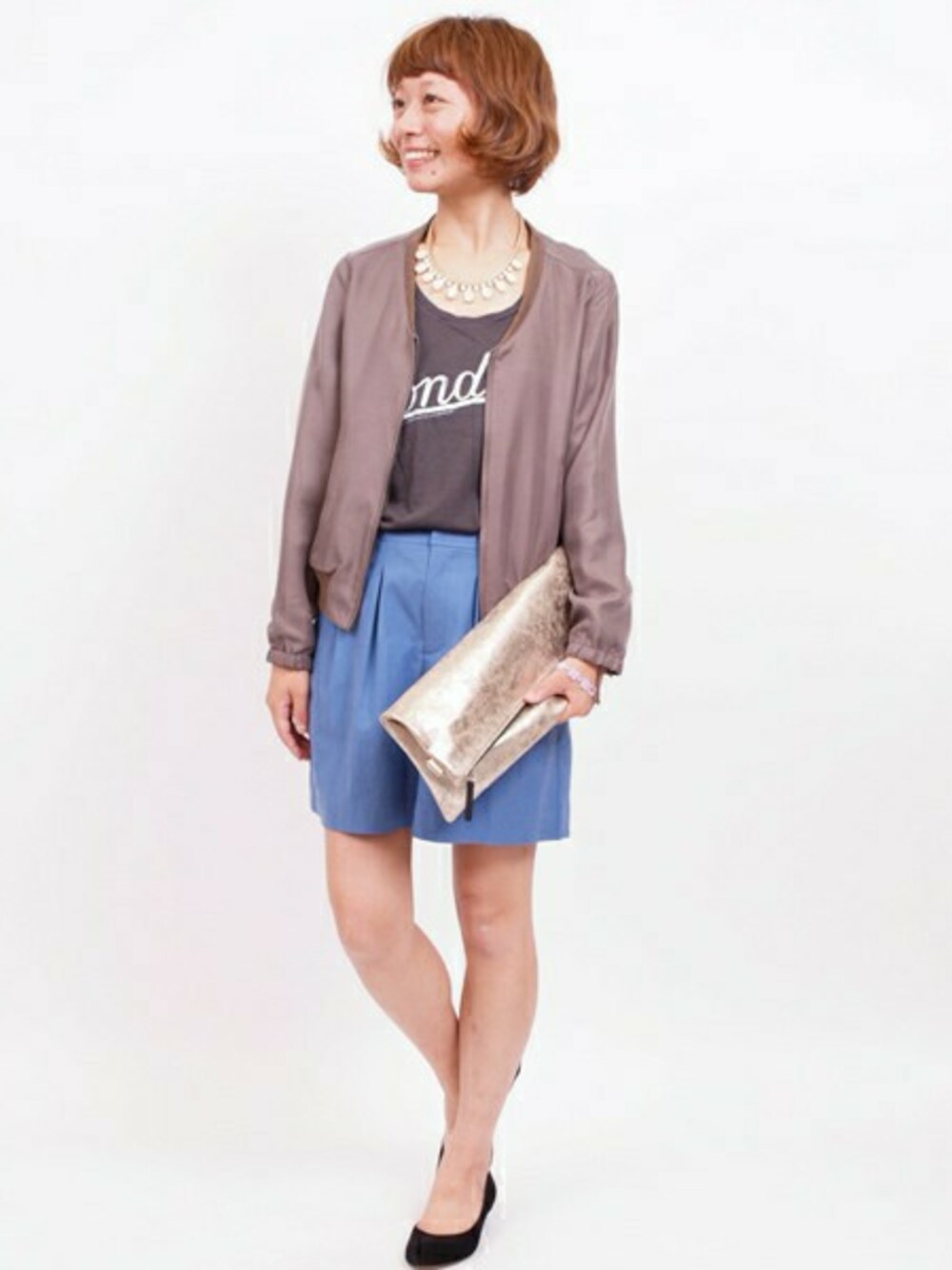 てろんとした落ち感のあるブルゾンは今の気温が不安定な時期にぴったりな一枚です。明るめのブルーカラーのキュロットを挿し色にしたお出かけスタイル。