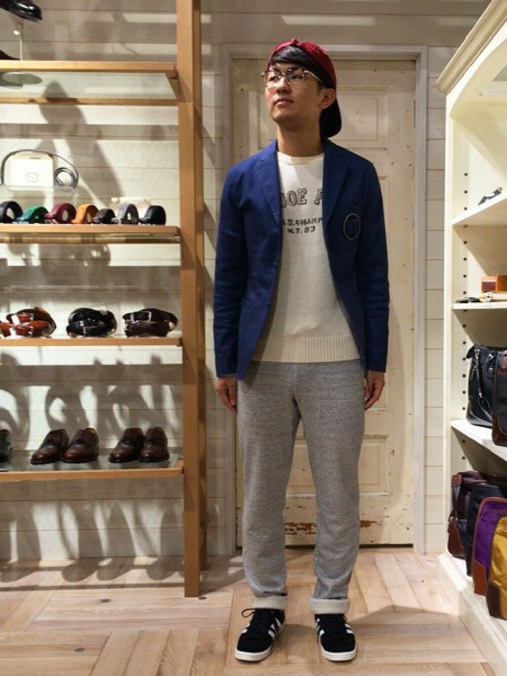 流行のCITY BOY STYLE!! 大人気細身スウェットパンツを合わせ、ジャケットスタイルを軽快に着こなす。