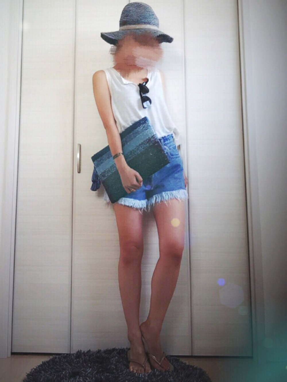 ビーズのクラッチバッグで夏らしさUP〜。 ちなみにセールで購入しました。 フェザーバングルはヘビロテ中。 このショーパン、ウエストもカットオフ加工で可愛いんです。 めずらし。